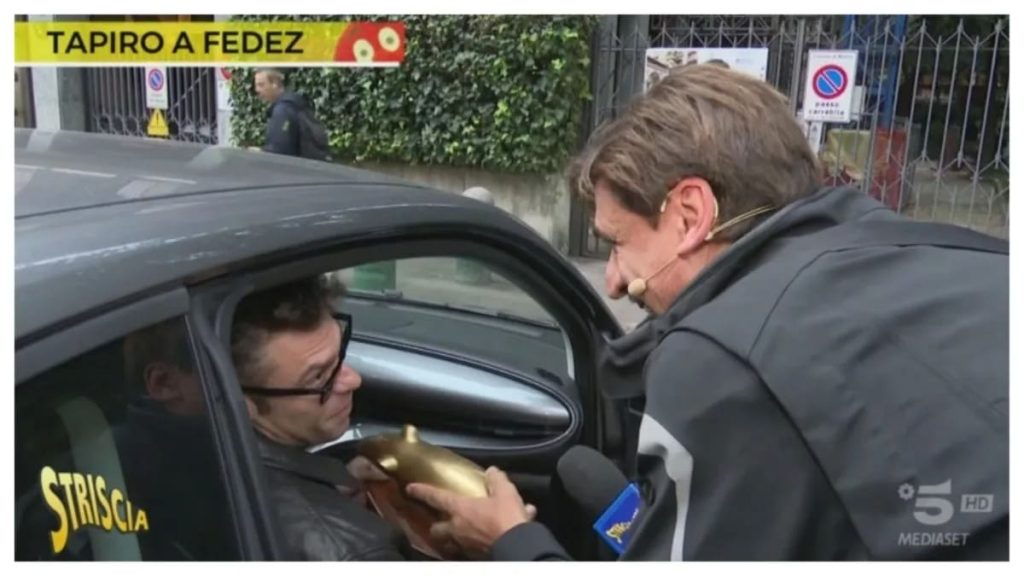 Altro Tapiro d’oro per Fedez, che non reagisce bene alla visita di Valerio Staffelli a Striscia la notizia. Il rapper, durante il servizio, stava salendo in auto, quando l’inviato del tg satirico di Canale 5 lo avvicina e gli spiega: “Siamo venuti a portare il Tapiro perché abbiamo visto che hanno arrestato il suo guardiaspalle factotum. Adesso come farà ad andare a fare le risse senza di lui?“.