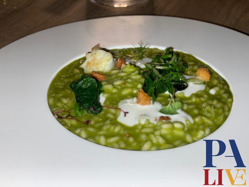 Prosegue con un estratto di prezzemolo con una spuma di patate, guscio di riccio fritto con polpa di riccio crudo. Il consiglio è di rompere il guscio col cucchiaio e mangiarlo assieme alla patate. Un piatto che colpisce particolarmente. Racchiude tutto il sapore del mare nella sua semplicità è geniale.