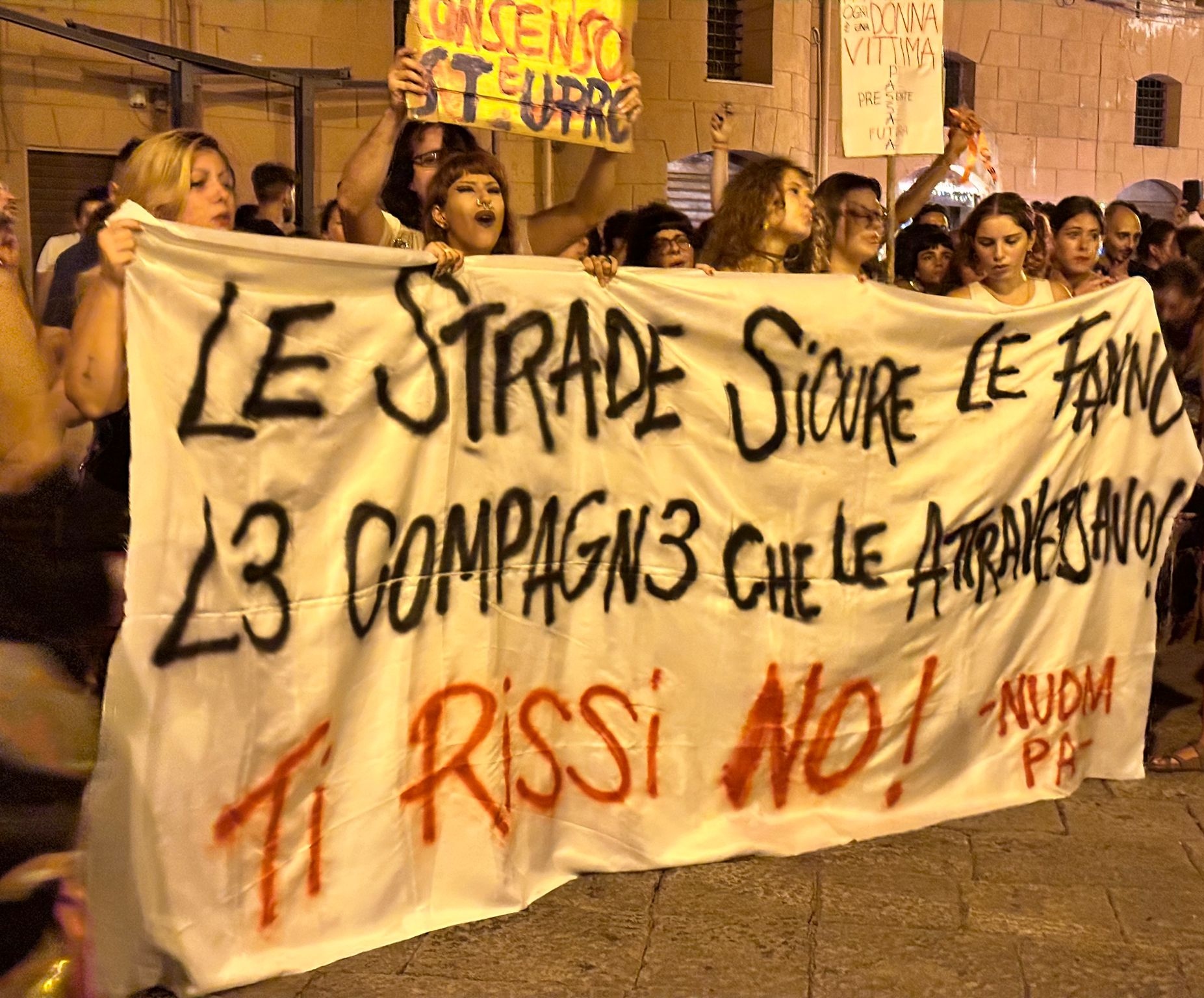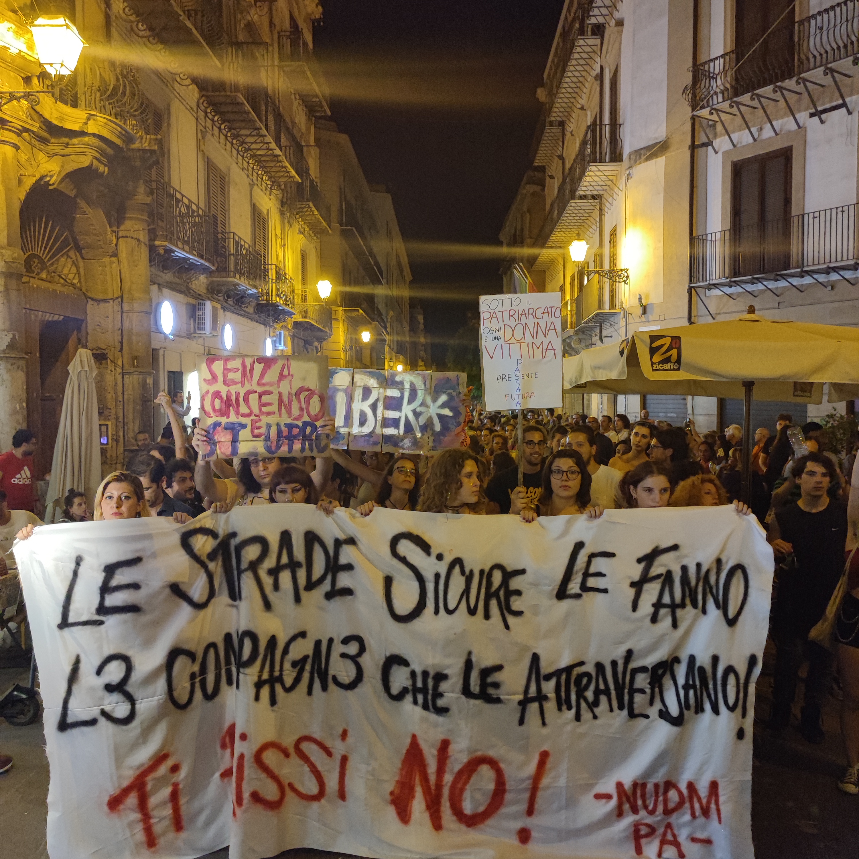 “No è no”, “Educate i vostri figli”, “Il sesso senza consenso è stupro”, “Sotto patriarcato ogni donna è vittima”. Queste le frasi impresse in alcuni cartelli esposti durante il corteo del movimento femminista e transfemminista. “Le strade sicure le fanno lɜ compagnɜ che le attraversano”, questo, invece, lo striscione dal messaggio chiaro che ha dato inizio al corteo formato da circa un migliaio di manifestanti, partito dalla Cala per raggiungere la Vucciria