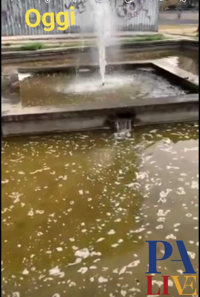 E invece, ancora una volta, la realtà racconta tutt’altro. Un esempio è dato da Piazza XII vittime, che per chi non ne fosse a conoscenza, commemora i tredici patrioti giustiziati senza un processo dopo il fallimento della rivolta della Gancia del 1860. Dello scultore Salvatore Valenti il monumento reallizzato in occasione del 23° anniversario dell’eccidio e situato in un angolo della piazza. Al centro della stessa, dedicato ai caduti degli omicidi di mafia, campeggia la torre minimalista in acciaio realizzata con il contributo di Fincantieri da Mario Pecoraino. Ma torniamo allo stato in cui versa oggi il monumento. La vasca della fontanta, nientemeno dal 2012, ha l’impianto idraulico guasto vista la portata dello zampillo. Mentre l’acqua è melmosa, sporca, maleodorante.