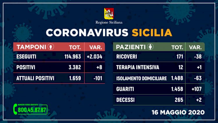 La Regione siciliana, come ogni giorno, ha comunicato all’Unità di crisi nazionale il quadro riepilogativo della situazione dell’Isola di oggi, sabato 16 maggio, aggiornato alle ore 17, in merito all’emergenza Coronavirus.