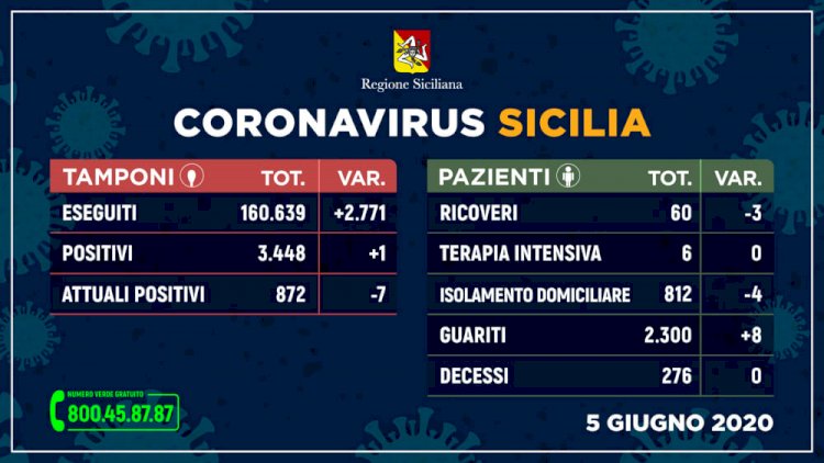 Nuovo caso positivo al coronavirus in Sicilia. Dopo due giorni di contagi zero oggi è stato accertato un nuovo contagio. In totale i contagi nell’Isola sono ad oggi 3.448. Cresce ancora il numero dei guariti e supera quota 2.300. Le vittime sono 276. Gli attuali positivi sono 872. La Regione Siciliana, come ogni giorno, ha comunicato all’Unità di crisi nazionale il quadro riepilogativo della situazione dell’Isola di oggi, venerdì 5 giugno, aggiornato alle ore 15, in merito all’emergenza Coronavirus.