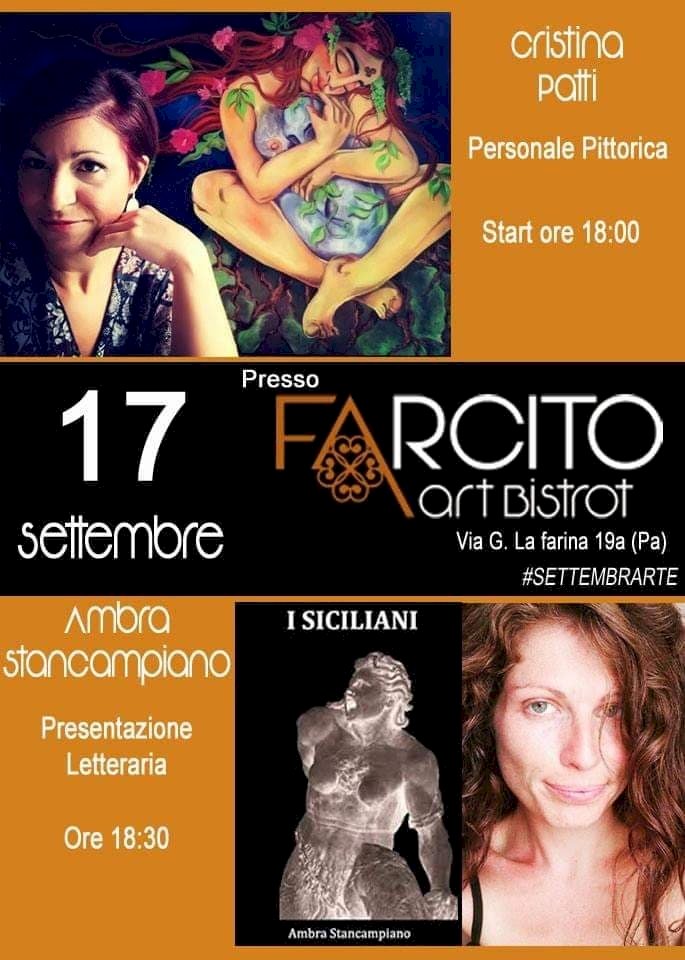 Anche un luogo tradizionalmente vocato al trionfo del gusto e dei sapori può diventare lo spazio prezioso che ospita iniziative culturali, stimolando dialoghi e sinergie diagonali tra forme d’arte diverse, quali la pittura e la letteratura: è quello che accadrà il 17 settembre a Palermo, presso i locali di Farcito Art Bistrot, in via Giuseppe La Farina 19/a dove, a partire dalle 18:00, la pittrice Cristina Patti e la scrittrice Ambra Stancampiano incontreranno il pubblico in occasione dell’inaugurazione di una mostra e della presentazione di un libro.