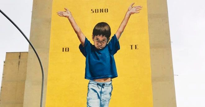 Il nuovo murale di Igor Scalisi Palminteri è stato appena completato, ed è forte, molto forte: nato sul muro di 18 metri di una palazzina dello Sperone, a pochi passi dalla scuola ICS Sperone-Pertini, vandalizzata durante il lockdown, è uno dei simbolo di questa difficile ripartenza. Per ricordare al mondo che i bambini non devono soffrire, e non solo a Palermo. “Io SONO te” è stato suggerito all’artista proprio da un suo piccolo amico che una volta lo ha aiutato con pennelli e colori. E dalla voglia di dire no a chi non dedica la giusta attenzione ai più piccoli.