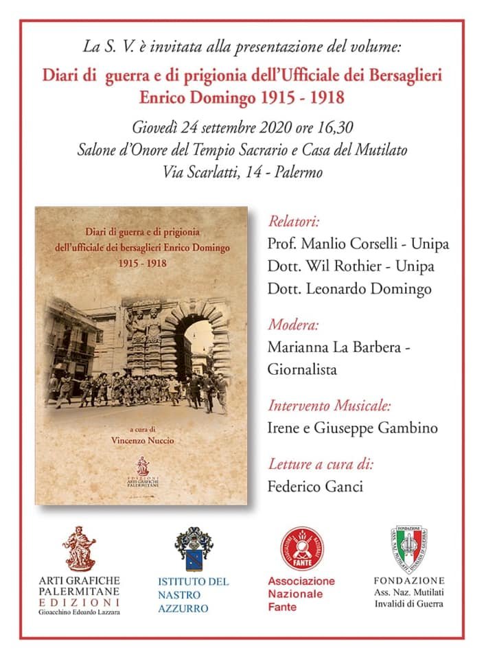 Diari di guerra e di prigionia dell’ufficiale dei bersaglieri  Enrico Domingo 1915 – 1918 ”:  è il titolo del libro che sarà presentato a Palermo il 24 settembre presso il Salone d’Onore del Tempio Sacrario e Casa del Mutilato in via Alessandro Scarlatti 14, alle 16:30.
