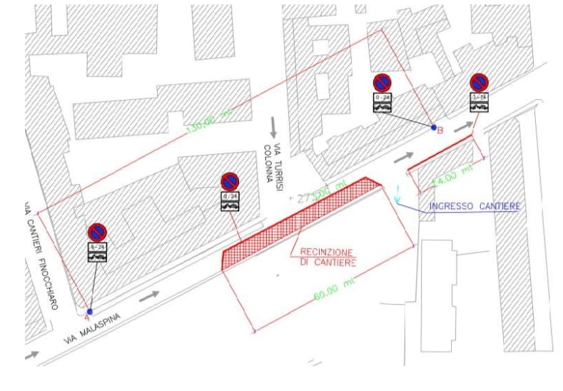 – Chiusura al transito veicolare e pedonale della porzione di carreggiata nel lato destro del senso di marcia, campita in giallo nella planimetria parte integrante del provvedimento, per la realizzazione di una recinzione “area di cantiere”, mantenendo una corsia di transito di larghezza pari a 3,50 m.