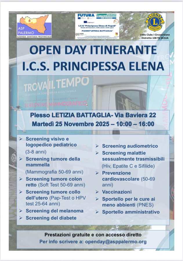Domani, martedì 25 novembre, l’Open Day Itinerante dell’ASP di Palermo farà tappa all’Istituto Principessa Elena del capoluogo (Via Baviera 22 – Plesso letizia Battaglia), con una giornata interamente dedicata alla prevenzione e ai servizi di prossimità aperti a tutta la cittadinanza. Dalle ore 10 alle 16 sarà possibile accedere gratuitamente ai principali screening oncologici (mammella, cervice uterina, colon retto e melanoma), ai percorsi di prevenzione cardiovascolare, agli screening pediatrici logopedico e visivo, al monitoraggio del diabete, allo screening audiometrico, ai servizi vaccinali e allo sportello amministrativo.