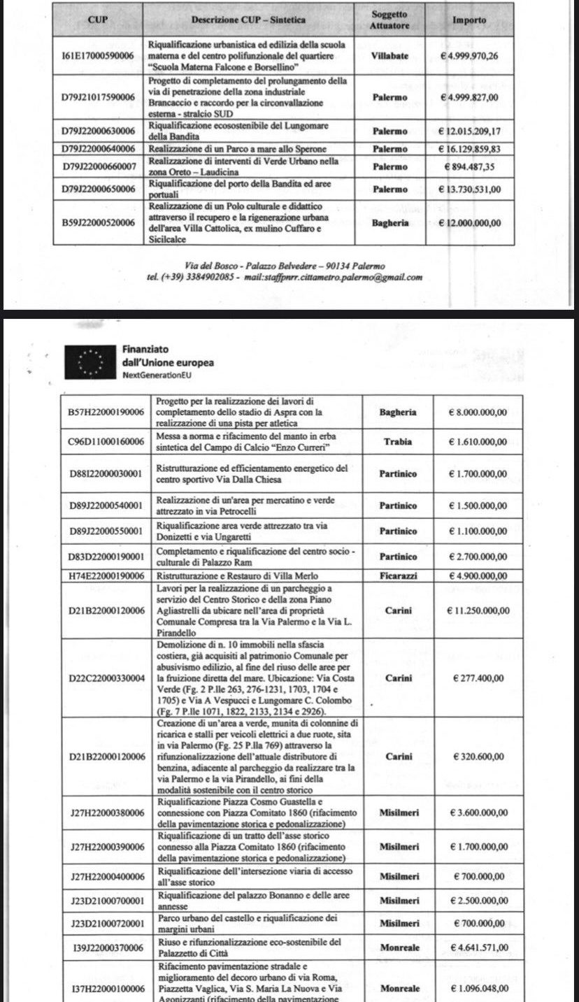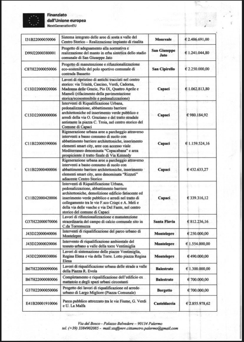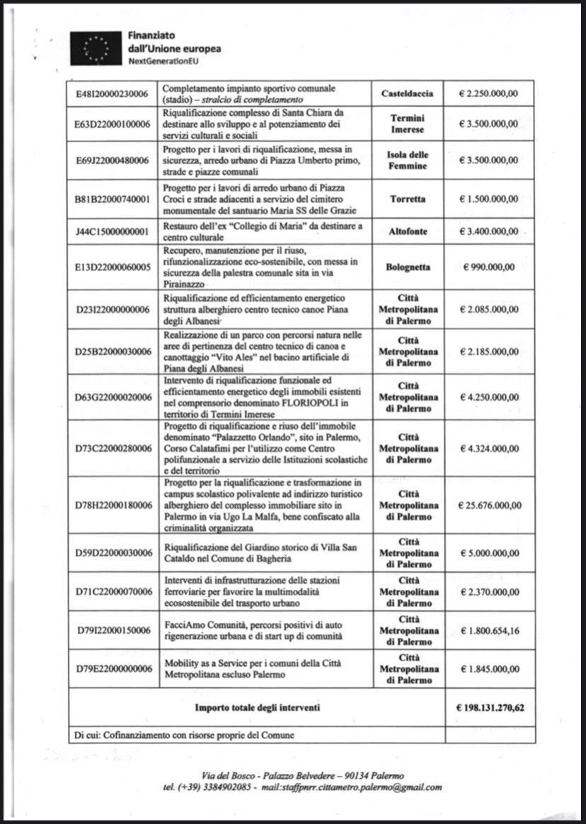 “Cari concittadini, Vi comunico, con enorme gioia e soddisfazione, che l’Ufficio Tecnico PNRR della Città Metropolitana di Palermo, ha finanziato il nostro progetto di ristrutturazione della Scuola materna “Falcone-Borsellino” e annessa palestra (scuola chiusa da tantissimi anni). Il finanziamento ammonta a 5 milioni di euro, e si è piazzato al primo posto su 159 progetti presentati da tutti i Comuni della provincia di Palermo!”