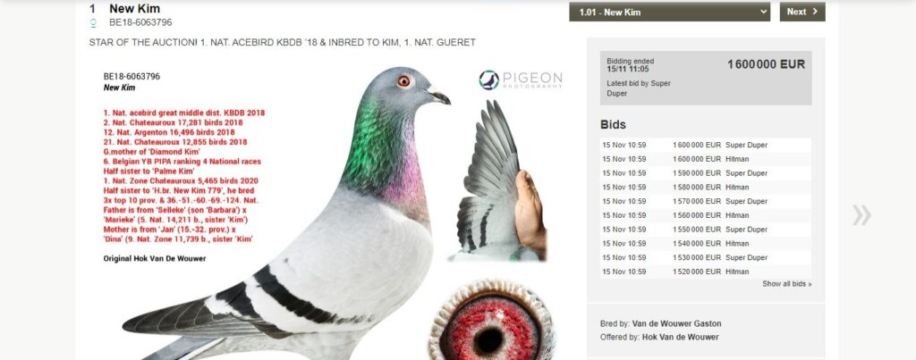 Asta da record in Belgio: un piccione da competizione è stato venduto per 1.600.000 (un milione seicentomila) euro. Si chiama New Kim ed è un piccione da competizione. Se lo è aggiudicato un acquirente, forse cinese, dallo pseudonimo di Super Duper, al termine di una accanita sfida con il rivale Hitman, nell’asta battuta dalla Pipa, Pidgeon paradise, cioè il pradiso dei piccioni, ad Anversa.