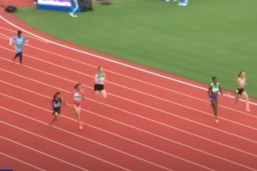 L’atleta ventenne ha concluso la corsa in 21.81 secondi. Talmente lenta e indietro rispetto alle colleghe che la regia ha finito per tagliarla fuori dall’inquadratura.