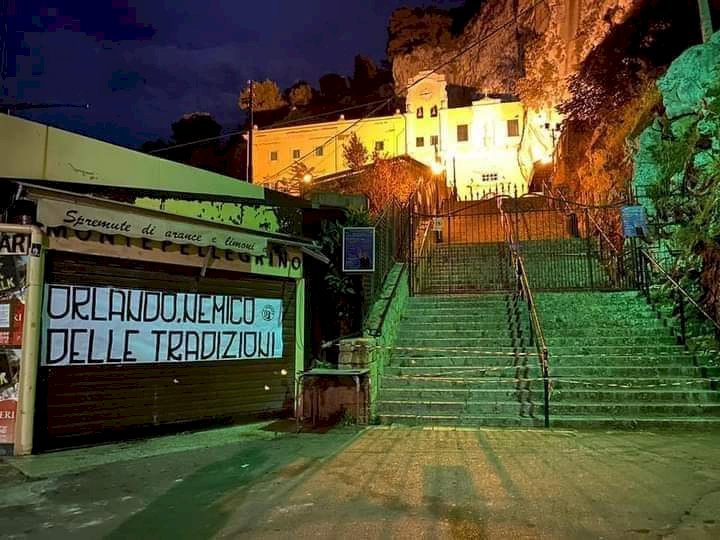 Lo striscione è apparso sotto alla scalinata, chiusa, che porta al Santuario di Santa Rosalia