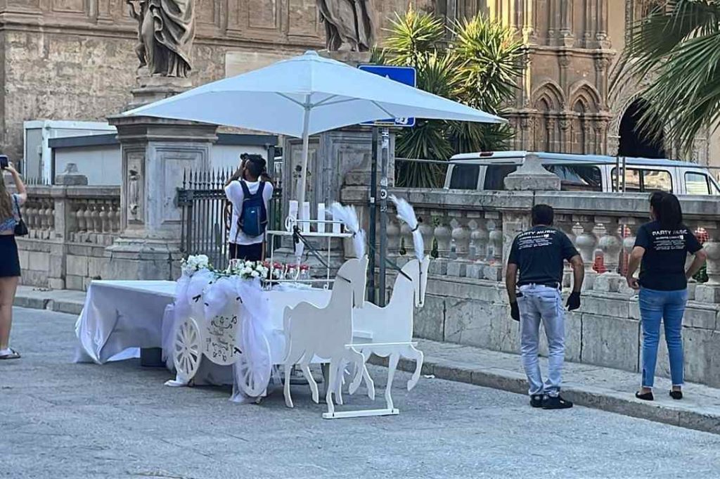Ci risiamo. Ancora un banchetto/rinfresco nuziale allestito in quelli che sono i luoghi simbolo della città di Palermo. Dopo i Quattro Canti, è la volta della Cattedrale.