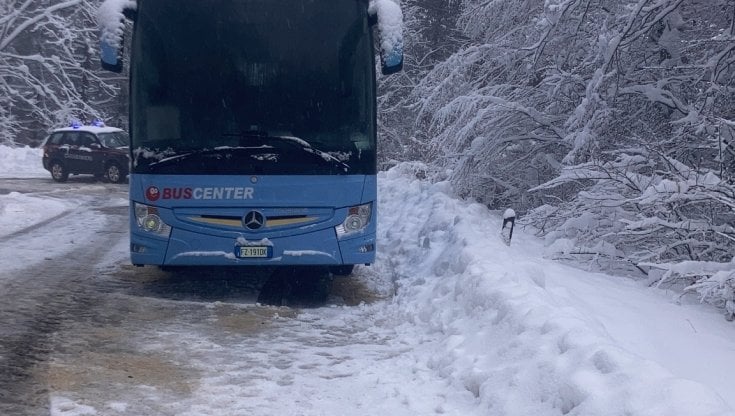 Attimi di paura per un gruppo di studenti e docenti di Palermo bloccati da una fitta nevicata. Il bus proveniente da un istituto alberghiero della città, in viaggio per Rimini, è rimasto bloccato lungo la statale 67 a San Godenzo (Firenze), in Mugello.
