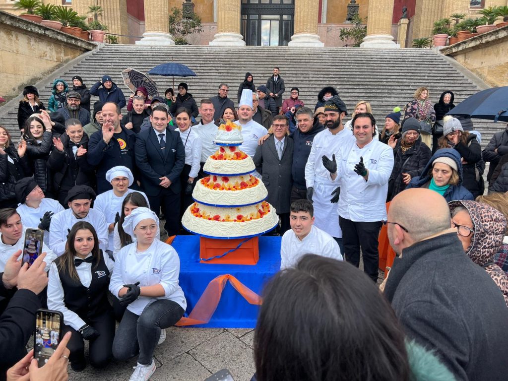 L’evento, si è svolto lo scorso 13 gennaio a Palermo in Piazza Giuseppe Verdi, ai piedi della scalinata del Teatro Massimo ed ha rappresentato un connubio tra tradizione e audacia gastronomica che ha messo in risalto la maestria dello Chef Catalano e della sua brigata di giovani nel reinterpretare il più classico ed appariscente dolce della tradizione siciliana.