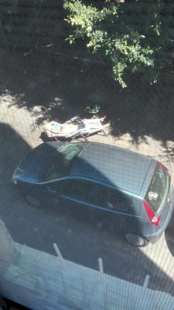 Il rispetto e la libertà devono essere reciproci. Un senzatetto è libero di vivere per strada, ma la sua libertà deve coincidere con la libertà degli altri. I residenti della zona hanno provato a parlare con l’uomo per cercare di migliorare la situazione, ma senza successo. Da qualche settimana, anzi, tutto è peggiorato: adesso i clochard sono due e a volte anche tre. A quanto ci raccontano, il nuovo ospite è ancora più “indisciplinato” del primo. Nella foto che vi mostriamo, prende il sole in costume sul marciapiede.