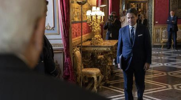 President of the Council in charge Giuseppe Conte (R) during the meeting with Italian President Sergio Mattarella (L), 04 September 2019. ANSA / Quirinal HO - Paolo Giandotti +++ ANSA PROVIDES ACCESS TO THIS HANDOUT PHOTO TO BE USED SOLELY TO ILLUSTRATE NEWS REPORTING OR COMMENTARY ON THE FACTS OR EVENTS DEPICTED IN THIS IMAGE; NO ARCHIVING; NO LICENSING +++