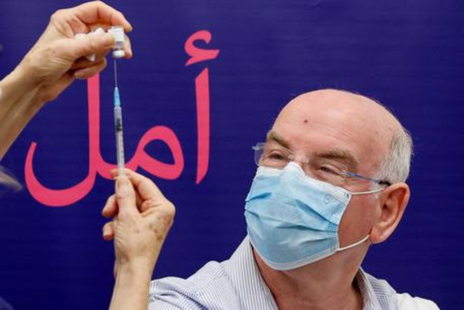 Israeli Professor Jacob Lavee receives a fourth dose of the Pfizer-BioNTech COVID-19 coronavirus vaccine at the Sheba Medical Center in Ramat Gan near Tel Aviv, on December 27, 2021, as the Israeli hospital conducted a trial of the vaccine's fourth jab on staff volunteers. (Photo by JACK GUEZ / AFP)