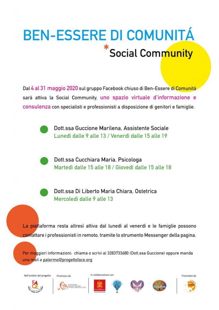 Insieme alla Fase 2, Palermo apre le porte al servizio Social Community di ‘Ben-essere di Comunità’,  uno spazio virtuale ma comunitario volto non solo all’informazione, ma alla formazione e alla consulenza, abbracciando in una rete le famiglie del territorio palermitano.  Esperti professionisti in ambito psicologico e sociale daranno consigli utili per  contrastare le crisi familiari, sociali, educative ed economiche che si creano ai lati della già critica pandemia.