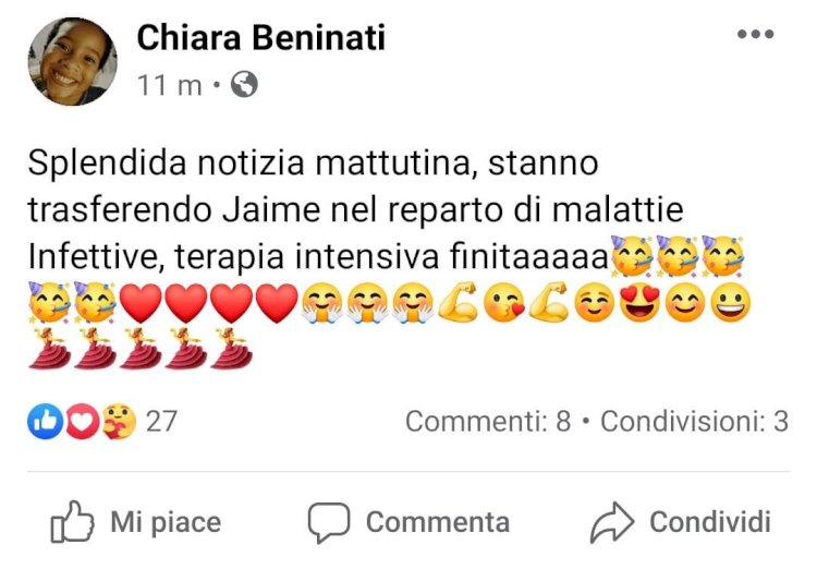 Una volta avvenuto il suo sbarco, Jaime è stato immediatamente ricoverato all’Ospedale V. Cervello, a causa delle sue gravi condizioni di salute. L’uomo, accolto nel reparto di terapia intensiva dallo scorso 7 maggio, circa 20 giorni fa, sta finalmente meglio. L’informatico di 49 anni, dopo una storia al quanto travagliata, può tirare un sospiro di sollievo. Questa mattina, infatti, Jiame lascerà la terapia intensiva. A mostare con soddisfazione la notizia è stata la moglie Chiara che con un post su Facebook annuncia con estrema gioia il trasferimento di Jaime al reparto di malattie infettive.