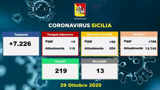 Sono 708 i nuovi positivi al Covid-19 registrati in Sicilia nelle ultime 24 ore. Salgono così a 12745 gli attuali positivi con un incremento di 557. Di questi 954 sono i ricoverati con un incremento di 56 nuovi ricoveri: 839 in regime ordinario e 115 in terapia intensiva con un incremento di quattro ricoveri. 11.791 si trovano in isolamento domiciliare.