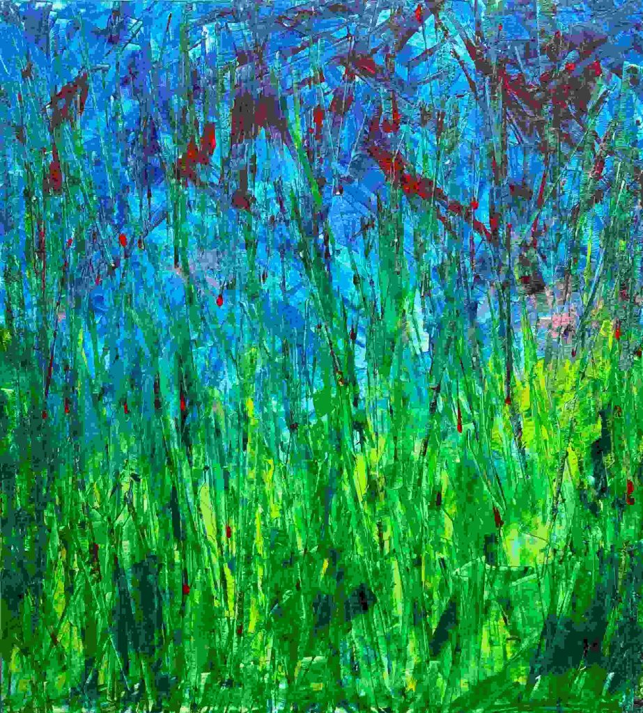 “Il sole diventa blu, il cielo sta in basso e le montagne galleggiano – osserva Sabrina Di Gesaro – delineando un’atmosfera irreale che appare come il frutto di un viaggio fantasioso dell’artista, in cui i colori non sono affatto relegati a un ruolo strumentale: ribelli, padroneggiano la tela rifiutando indomiti l’utilizzo dei pennelli, alla ricerca della libertà, elemento che contraddistingue questa ultima produzione”.