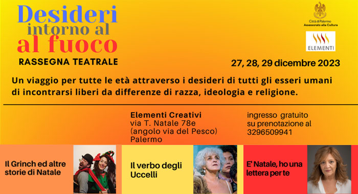 Desideri intorno al Fuoco è una rassegna teatrale per tutte le età che si svolgerà mercoledì 27, giovedì 28 e venerdì 29 dicembre 2023 presso l’associazione Elementi Creativi grazie al sostegno dell’Assessorato Cultura del Comune di Palermo che quest’anno intende offrire alla cittadinanza un programma di eventi culturali anche nelle periferie, interessando e valorizzando tutto il territorio.