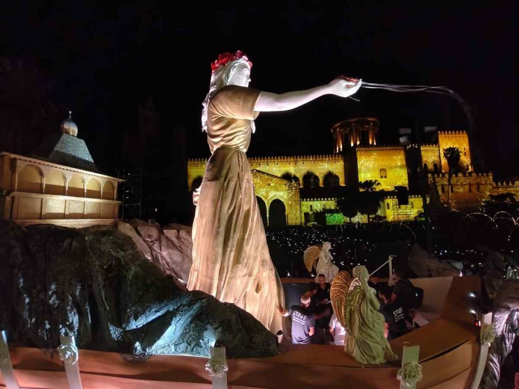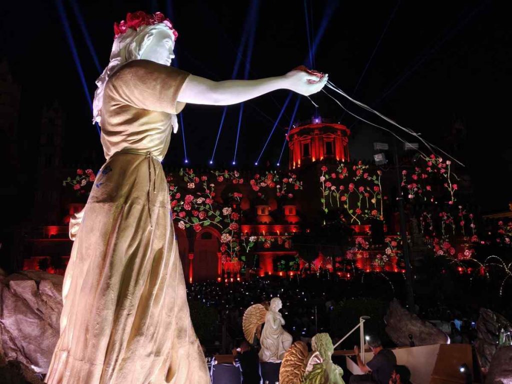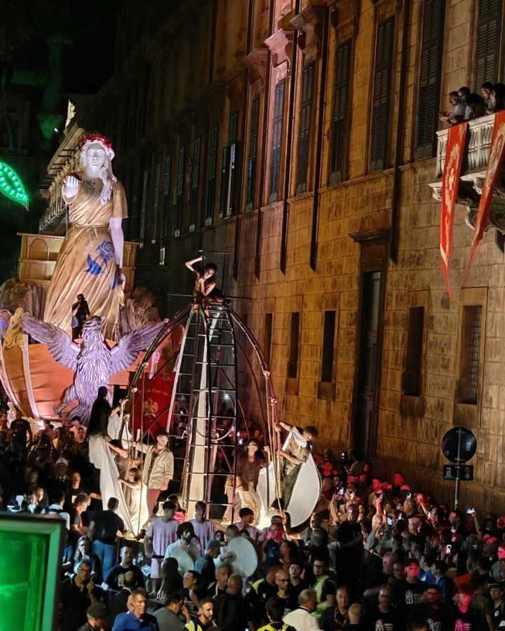 Un carro-teatro ha affiancato quello trionfale, rappresentando il disordine dettato dalla paura della peste. L’artista Simona Malato ha dato voce alla città, alla ricerca di qualcosa che potesse restituire unità e bellezza in luogo di caos e prevaricazione. Nel corso delle varie tappe, si è così tenuto un dialogo con le forze primigenie: c’è la morte, impersonata da Vincenzo Pirrotta a Palazzo dei Normanni, e la vita, Isabella Ragonese alla Cattedrale. Tradizione e innovazione si sono mescolate nel ricorso a videomapping e arte performativa per uno spettacolo senza dubbio suggestivo.