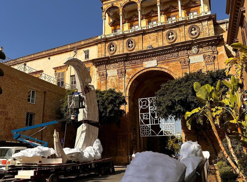 Il carro per il 399° Festino di Santa Rosalia è ormai quasi ultimato. Da via Decollati l’opera è stata spostata sulla parte alta del Cassaro, dove la grande luna di 12 metri che la caratterizza sarà ricomposta per poi sfilare nella tanto attesa processione di domani. Il progetto cela diversi significati simbolici, a partire dall’utilizzo di materiale di risulta per la sua realizzazione: un aspetto che rimanda a quella frugale semplicità promanata e vissuta da Biagio Conte, a cui si deve anche la collocazione della Santuzza in una posizione che la renda “più vicina” alla gente.