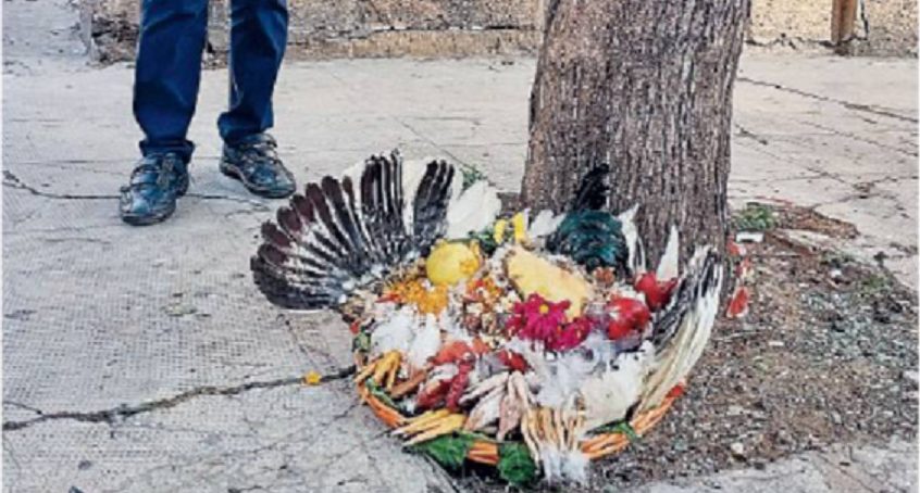 Chi ieri è passato vicino l’incrocio di via Lascaris e via Imera ha potuto vedere qualcosa di raccapricciante. Nell’aiola sotto un albero c’era un canestro che conteneva galline sgozzate e zampe di gallinacei. Ma anche, teste mozzate, piume, qualche ananas e qualche mela fra fiori e steli di erba. Come si legge oggi sul Giornale di Sicilia, si tratta di una specie di composizione che lascerebbe trasparire un rito malefico o propiziatorio. Lo afferma don Mauro Billetta, parroco della chiesa di Sant’Agnese, in zona Danisinni. Secondo la sua interpretazione l’artefice potrebbe essere un palermitano o qualcuno di altra nazionalità. Il luogo del ritrovamento è sempre popolato, e questo lascia presumere che è stata una messa in scena notturna. Una passante, di origine equadoregna, residente a Palermo da vent’anni ha commentato: «Ho visto nel marciapiede una scatola con galline squartate. Nel mio paese fatti simili sono frequenti, in ogni tribù esiste lo sciamano. Per tali pratiche sono famosi gli Tsachilas di Santo Domingo e di Esmeraldas in Equador. Qui sembra proprio fuori luogo. Sono tempi strani questi, la gente è spaesata, troppi brutti avvenimenti e il Covid ha fatto la sua parte».