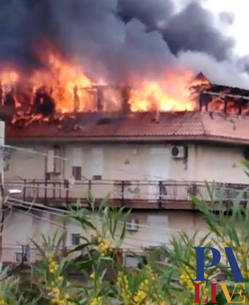 L’incendio sul tetto di un palazzo, nei pressi di “Villa Fabiana”. Edificio evacuato e pronto intervento dei vigili del fuoco a spegnere le fiamme