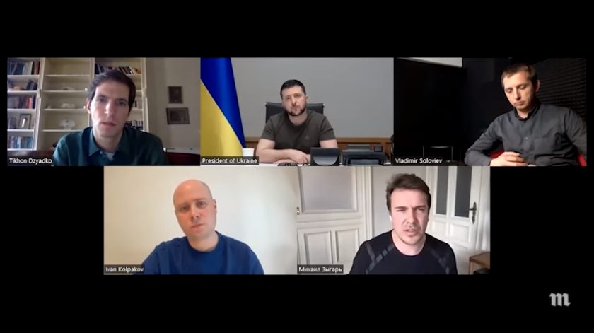 Ieri il presidente ucraino Volodymyr Zelensky per la prima volta dall’inizio della guerra ha rilasciato un’intervista a giornalisti russi, che hanno promesso di pubblicare l’intera conversazione senza censure. Da quando il 24 febbraio scorso è iniziato il conflitto, non era ancora successo. L’incontro dei quattro giornalisti russi indipendenti si è svolto su Zoom. Oltre al presidente ucraino, sullo schermo c’erano: Ivan Kolpakov, caporedattore della testata online russa Meduza; Tikhon Dzyadko, caporedattore del canale televisivo Dojd; Mikhail Zygar, scrittore e giornalista; Vladimir Solovyov, corrispondente di Kommersant. La conversazione è durata due ore. L’annuncio dell’intervista è arrivato a sorpresa, fino all’ultimo le stesse autorità russe non ne erano al corrente.