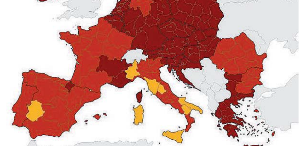 Il Centro europeo per la prevenzione e il controllo delle malattie, l’Ecdc, colora la sua mappa di rosso e arancione tutta Europa, “salvando” e lasciando in giallo solo una parte dell’Italia e una regione della Spagna, l’Estremadura. Occorre tenere presente che il criterio dei colori usato dall’Ecdc non è lo stesso in vigore in Italia. Da noi sono legati alle restrizioni più o meno dure, mente in Europa si guarda solo all’andamento dei contagi: si va dal dal verde, quando sono pochi, e poi si passa all’arancione fino al rosso chiaro e al rosso scuro, via via che il livello diventa più alto.