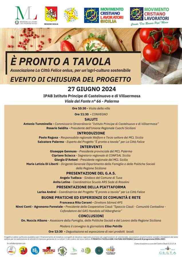 Il 27 giugno alle ore 11,30, presso l’Ipab Istituto Principe di Castelnuovo a Palermo si terrà l’evento conclusivo del progetto “È pronto a tavola”, promosso dall’Associazione “La Città Felice” ONLUS e dai partner MCL Sicilia e MCL “Don Rosario Pepe” di Mineo, con il patrocinio del Ministero del lavoro e delle politiche sociali e dell’Assessorato della Famiglia, delle Politiche Sociali e del Lavoro della Regione Siciliana.