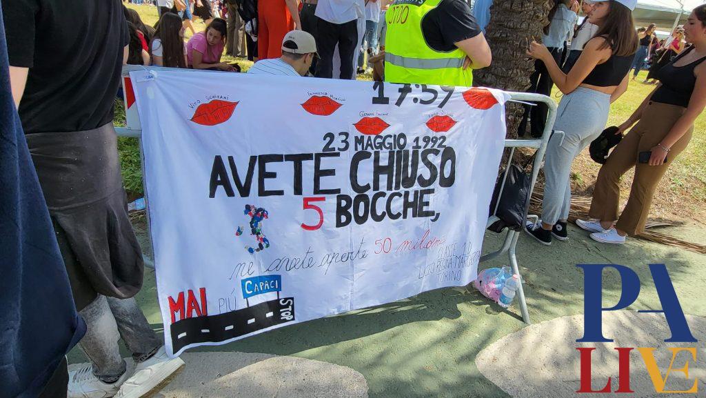 “Chi tace e chi piega la testa muore ogni volta che lo fa. Chi parla e chi cammina a testa alta muore una volta sola”. Così recita un lenzuolo affisso a una transenna. È solo una delle tante massime di Giovanni Falcone che in questo momento riempiono il Foro Italico di Palermo. I morti per mano mafiosa, i loro nomi, le loro idee, riecheggiano da un angolo all’altro: da Peppino Impastato fino al piccolo Giuseppe Di Matteo. Una giornata dedicata al ricordo ma anche al futuro, incarnato proprio dalla presenza di questi giovanissimi all’occasione.