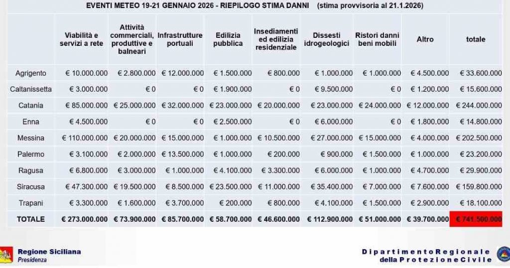 Da una prima ricognizione ad opera della Protezione civile regionale, i danni provocati dal ciclone Harry in Sicilia ammontano al momento a 740 milioni di euro. A darne notizia è il presidente della Regione Siciliana, Renato Schifani, che ha incontrato i giornalisti a conclusione della giunta straordinaria di stamani, a Palazzo d’Orléans, che ha deliberato lo stato di calamità e un primo stanziamento di 70 milioni di euro: 50 milioni subito disponibili, gli altri 20 dai fondi globali mediante apposita norma che sarà proposta all’Assemblea regionale siciliana.