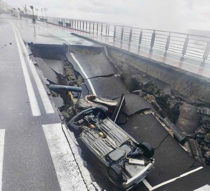 A causa della furia del mare, si è aperta una voragine, sotto l’asfalto, che con il peso dell’auto si è aperta e ha inghiottito l’auto, mettendo seriamente a rischio l’incolumità del conducente. Il conducente è stato recuperato dai volontario e ricoverato con ferite varie”.