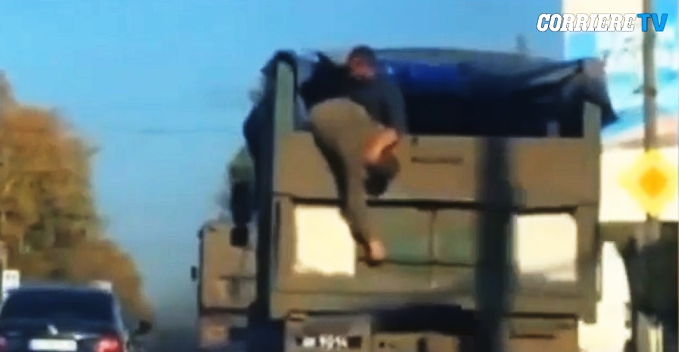 Militari russi in fuga si picchiano su un camion: uno sta per cadere – VIDEO