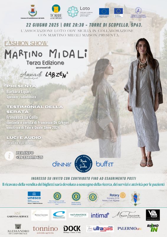Un appuntamento atteso, un messaggio importante, una serata che lascia il segno. Dopo il successo delle passate edizioni, torna a illuminare la Torre di Scopello il “Fashion Show” firmato Martino Midali, in collaborazione con Loto ODV Sicilia, in programma domenica 22 giugno alle 20:30.