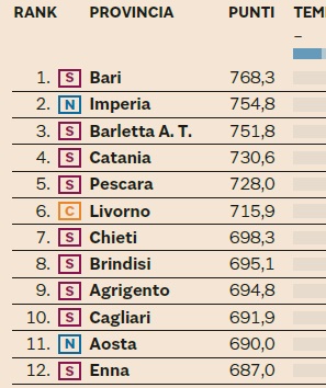 Oltre a Bari, altri sei centri urbani del Sud popolano la top ten del benessere climatico: nell’ordine Barletta-Andria-Trani (3ª), Catania (4ª), Pescara (5ª), Chieti (7ª), Brindisi (8ª), Agrigento (9ª), Cagliari (10ª). In evidenza, quindi, città delle zone costiere. Ma all’11° e 12° posto ci sono Aosta ed Enna, due città decisamente in quota. Per trovare Palermo occorre scorrere la classifica fino al 27° posto. Il capoluogo siciliano è preceduto da Roma e Napoli. Le posizioni di classifica della altre 5 città isolane sono: Trapani 19ª, Caltanissetta 24ª, Siracusa 54ª, Messina 63ª e Ragusa 80ª, che precede di sei posizioni Milano . L’ultima città di questa classifica è Belluno, al 107° posto.