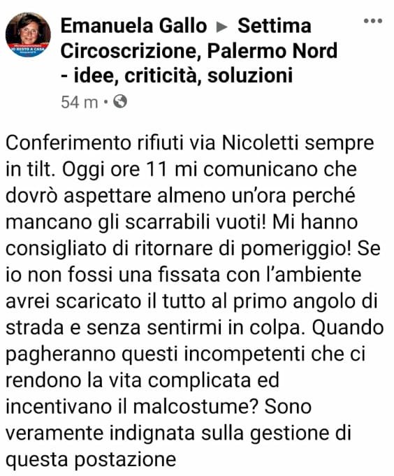 È stato inaugurato ad ottobre dello scorso anno, e da allora, il terzo Centro Comunale di raccolta differenziata di via Rosario Nicoletti (nonchè del servizio di ritiro rifiuti ingombranti e RAEE) a Palermo è divenuto un punto di riferimento per tutti gi abitanti della VII circoscrizione. Per intenderci quella che comprende le borgate e i quartieri Arenella – Vergine Maria – Pallavicino – Tommaso Natale – Sferracavallo – Partanna Mondello – Mondello. Un servizio importante, voluto dal Comune, con l’intento di rendere il più partecipe possibile le persone che hanno a cuore la tutela dell’ambiente. Se non fosse che, non è raro ravvisare le lamentele di chi il suddetto sito non sempre lo trova pronto ad erogare il servizio per cui è nato. Nella fattispecie, è la signora Emanuela Gallo a dirsi indignata tramite un post pubblicato stamattina su Facebook.