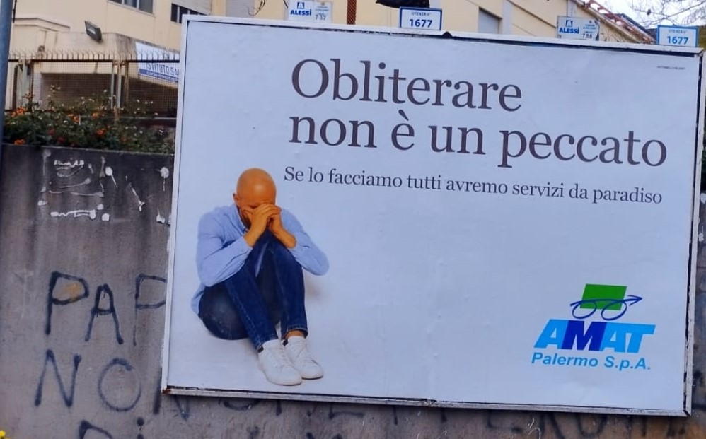 “Obliterare non è un peccato. Se lo facciamo tutti avremo servizi da paradiso”. Così recita il testo della nuova campagna pubblicitaria Amat, l’azienda municipale dei trasporti del capoluogo.