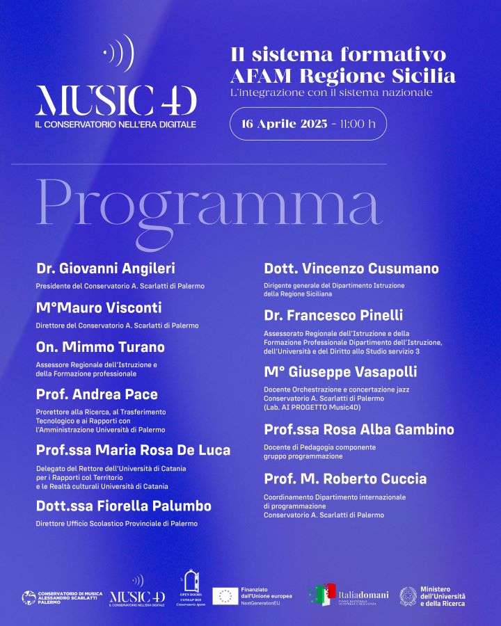 A partire dalle ore 9.30, un dialogo attivo tra professionisti, docenti, studenti e aspiranti allievi sulle opportunità offerte dall’istruzione musicale integrata alle tecnologie, promuovendo una governance efficace nel settore AFAM – Alta Formazione Artistica Musicale e Coreutica, e al centro del progetto PNRR MUSIC4D. Le note dell’Orchestra del Conservatorio risuoneranno negli spazi di Via Squarcialupo e anticiperanno i lavori che prenderanno il via con l’intervento dell’On. Mimmo Turano, Assessore Regionale dell’istruzione e della formazione professionale; con lui anche il Dr. Giovanni Angileri, Presidente del Conservatorio A. Scarlatti di Palermo, il Mo Mauro Visconti, Direttore del Conservatorio di Palermo, il Prof. Andrea Pace, Prorettore alla Ricerca, al Trasferimento Tecnologico e ai Rapporti con l’Amministrazione di Unipa, la Prof.ssa Maria Rosa De Luca, Delegato del Rettore per i Rapporti col Territorio e le Realtà culturali Università di Catania e la Dott.ssa Fiorella Palumbo, Direttore Ufficio Scolastico Provinciale di Palermo.