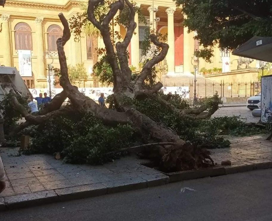 Un grosso albero è caduto la scorsa notte in Piazza Verdi, proprio davanti al Teatro Massimo, a Palermo.