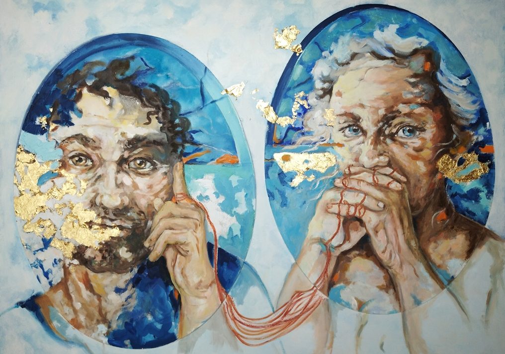 Da un’altra ancora i fili di spago intrecciano legami tra i soggetti ritratti nei suoi tondi e tra le entità delle poesie sculturate di Giovanna Fileccia, ma anche tra i solchi e le rughe che scavano visi sia nelle tele sia nelle poesie, fino a scandagliare l’anima.