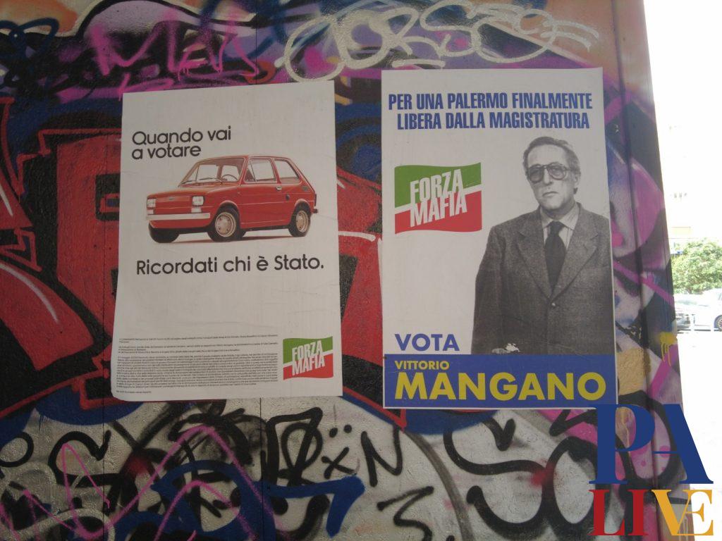 E poi un altro finto manifesto elettorale con la foto dello stalliere di Arcore Vittorio Mangano, definito da Paolo Borsellino una delle teste di ponte dell’organizzazione mafiosa del Nord Italia; l’uomo chiave che portò Silvio Berlusconi e l’ex senatore di Forza Italia, Marcello Dell’Utri, ad essere indagati come mandanti delle stragi di Capaci e di via D’Amelio. In alto la scritta “Per una Palermo finalmente libera dalla magistratura vota Vittorio Mangano” e l’immancabile simbolo “Forza mafia”.