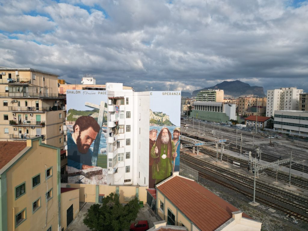 «Era la fine dell’estate quando Don Pino mi ha chiamato chiedendomi di passare alla Missione, io ero a Palermo e ci sono andato subito – ha raccontato Igor Scalisi Palminteri – Quella sera stessa ci siamo trattenuti a lungo a parlare su cosa potevamo dipingere relativamente all’idea che volevamo comunicare. Il cuore pulsante della Missione e della vita di Biagio Conte è sicuramente l’accoglienza, per cui ci siamo soffermati in modo particolare su questo aspetto. Il primo muro infatti è visibile dalle ferrovie e chi arriva in città con il treno non può non vedere Biagio Conte a braccia aperte. Sono onorato di aver fatto questo dittico perché sono convinto che Biagio rappresenti tutta Palermo, non solo quella che accoglie, ma anche quella non accolta degli ultimi e degli emarginati.