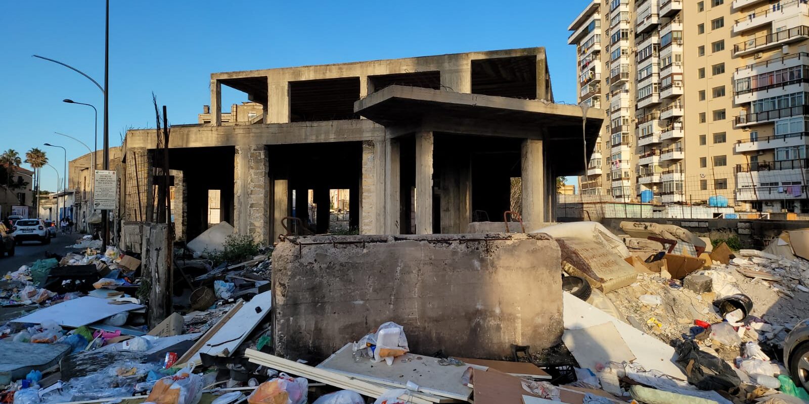 Palermo, incendio in via Tiro a Segno: cumuli di rifiuti in fiamme nell’ecomostro