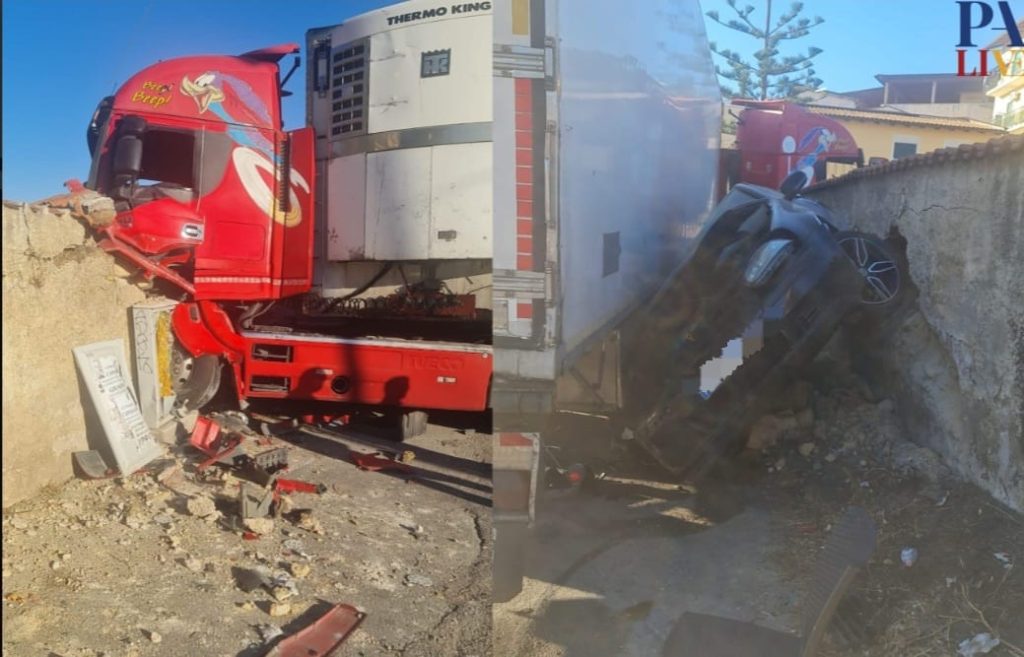 Il mezzo pesante, per evitare l’impatto frontale con l’autovettura, si è letteralmente schiantato contro il muro schiacciando una delle auto parcheggiate.