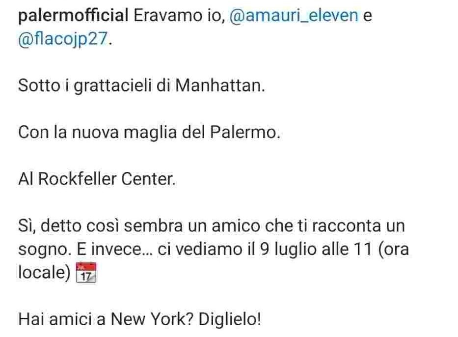Palermo, svelato il mistero: ecco cosa accadrà il 9 luglio a New York