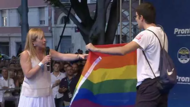 Appena salita sul palco in piazza del Carmine, Giorgia Meloni è stata raggiunta da un giovane che, bandiera arcobaleno alla mano, le ha chiesto di garantire i diritti delle persone della comunità Lgbt+, in particolare il diritto al matrimonio.